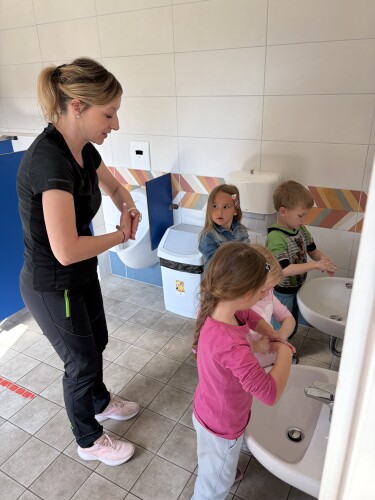 Pri osebni higieni so otroci spoznali zakaj in kdaj je pomembno umivanje rok ter si umili roke ob pesmi traktor. Sledilo je barvanje pobarvanke umivanja rok.