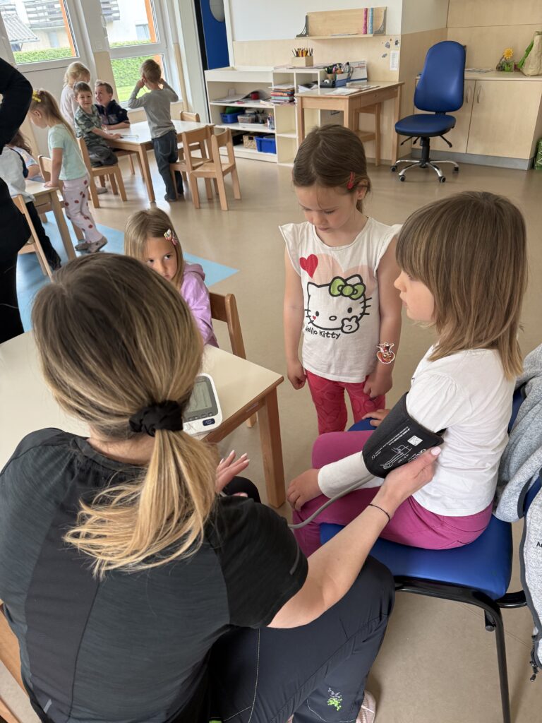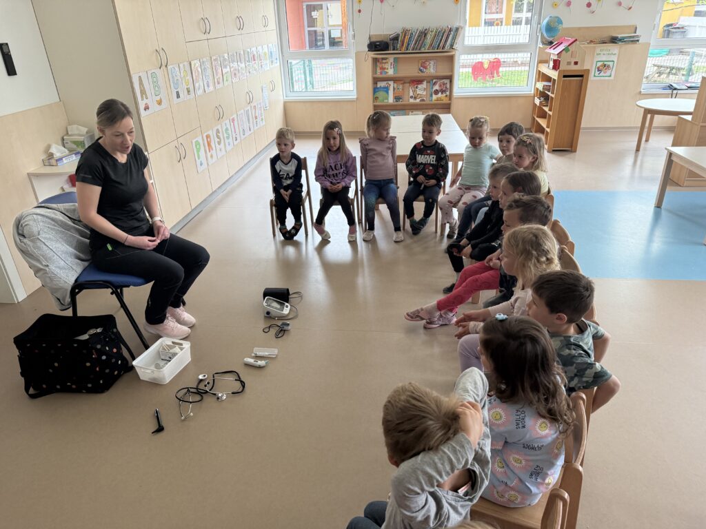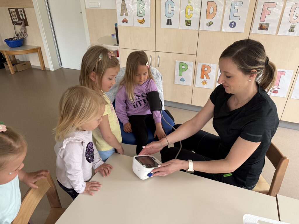 Medicinska sestra Andreja Jurca iz Zd Vrhnika je otrokom starejših skupin na prikupen, zanimiv, otrokom razumljiv način predstavila zdrave navade, osebno higieno ter približala poklic zdravnika.